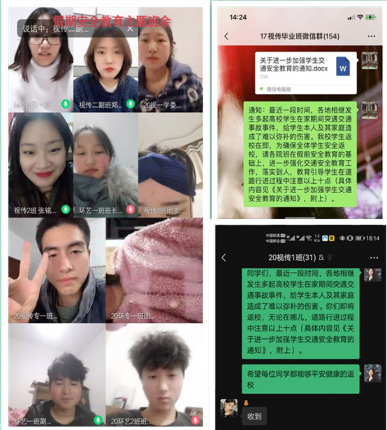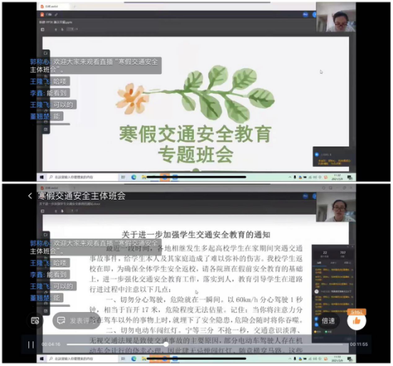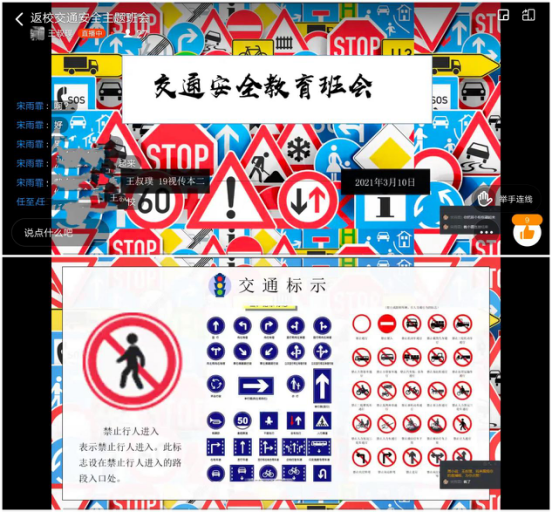 班会以线上云班会的形式开展。班会上,各班辅导员老师强调了交通安全知识,主要包括:步行安全知识、乘车安全知识、交通事故逃生常识、骑车须知、行人应遵守交通法规和公共道德以及乘车公共道德。并提出要求:外出要注意交通安全,严格遵循交通规则,提高交通安全意识。做到不闯红灯,远离大货车,礼让斑马线,不酒后驾驶,不疲劳驾驶,骑车戴好安全头盔等。同学们也纷纷在线发表关于交通安全的看法,班会反响良好。