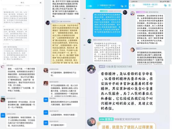 活动三:各团支部进行活动总结。通过各类学习实践活动的开展,作为新时代青年,大家对雷锋的精神与事迹都铭记在心,大家通过班级交流平台进行活动分享并发出倡议:从我做起,争做雷锋精神传播者,勇做雷锋精神践行者,立志做党的光荣传统和优良作风的忠实传人,服务人民、奉献祖国,以青春的力量和行动向建党百年献礼。