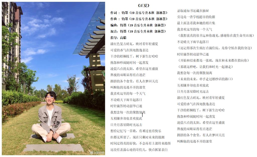 郭林慧,男,1998年生,汉族,19音乐专升本班员工,河南安阳人。2019年考入yL23411永利集团官网,师从于柴占红老师,专攻流行音乐方向。他喜欢写词,做音乐。跟着高聪老师学习音乐编曲,至今已发表10余首歌曲,大多数为原创歌曲。现用笔名:钧墨。