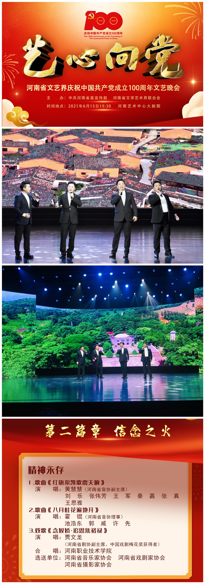 “艺心向党”——河南文艺界庆祝中国共产党成立100周年文艺晚会由中共河南省委宣传部、河南省文学艺术界联合会主办,由省作家协会、省戏剧家协会等共同承办,活动旨在隆重庆祝中国共产党成立100周年,充分展示全省文艺工作者的崭新面貌,激发爱党热情、凝聚奋进力量。