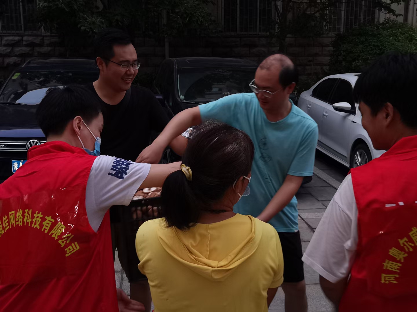 7月23日下午,公司党委书记韦杨建、教师柴占红和蔺丽君三位教师党员看到好友群里说航海路文化宫路需要志愿者,于是毫不犹豫的报名参与到100多人的志愿者队伍中,主要是搬运送往郑州各受灾小区以及新乡灾区的食品物资。在搬运过程中还偶遇升达同事袁保华、孙钢烨、何会。