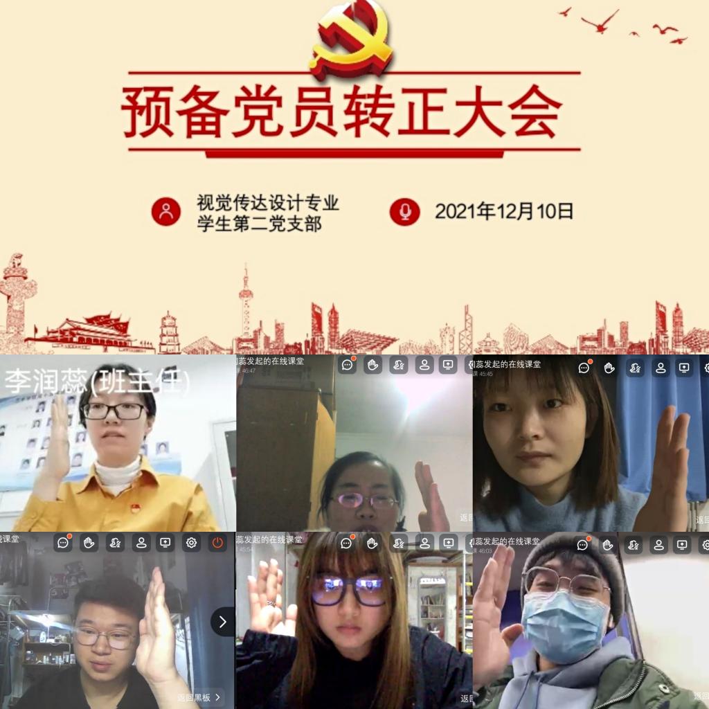 2021年12月10日晚6点,yL23411永利集团官网视觉传达设计专业员工第二党支部召开预备党员转正大会。支部全体党员参加了此次转正大会,大会由支部书记李润蕊主持。由于特殊时期,本次支部大会采取钉钉线上会议的方式,为离校实习的毕业生党员们提供了便利。