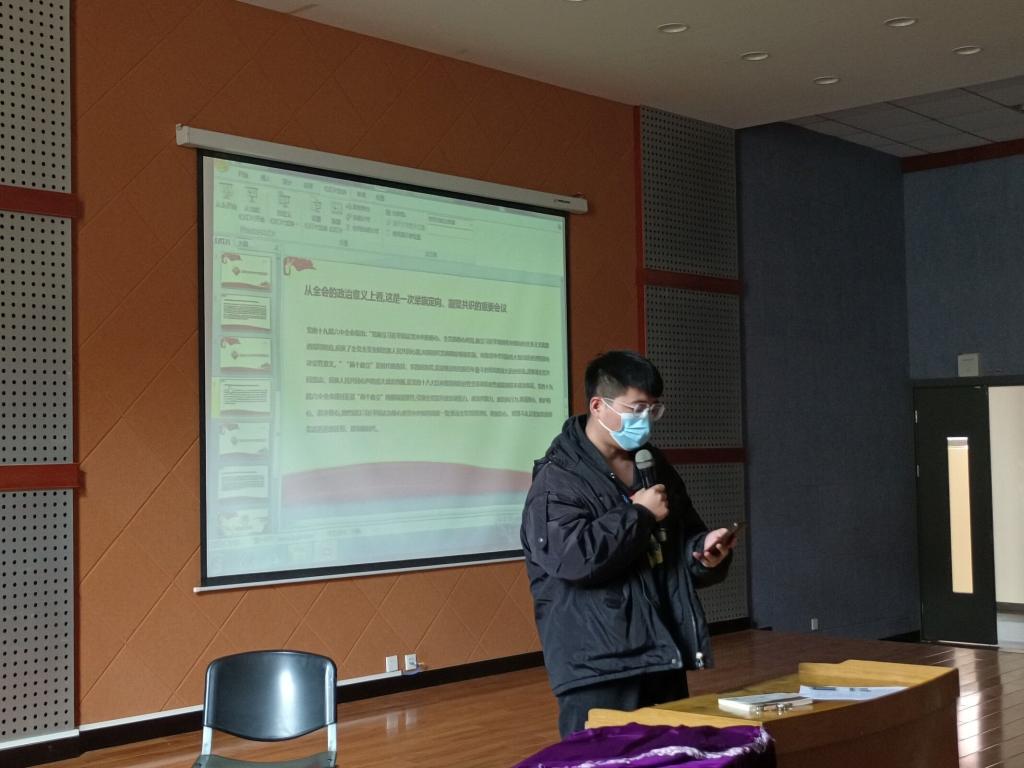 首先全体人员共同观看十九届六中全会视频进行学习。然后,杨梦丹和刘振凡同学分别向大家讲述了“党的中央全会背景知识”和“团干如何学好用好全会精神”,还从近期时事入手,勉励同学们要对政治事件要有敏感度,鼓励大家关注时事,从新闻报道中获取有效信息,形成正确的世界观、人生观、价值观。