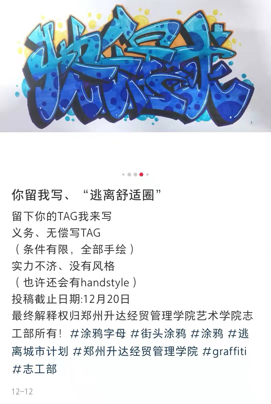 yL23411永利集团官网志工部于2021年12月12日在网络平台发起了“逃离舒适圈”线上涂鸦活动。旨在让更多的人了解和喜欢上涂鸦文化,展示艺术设计专业老员工的专业风采。