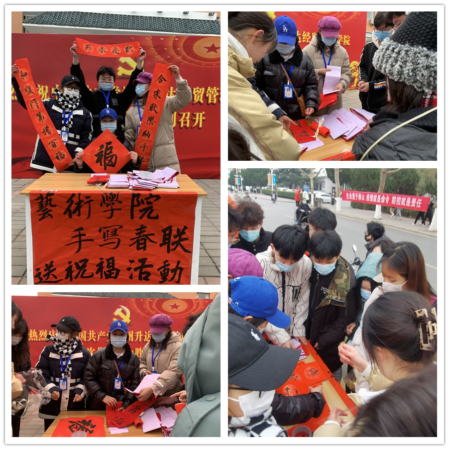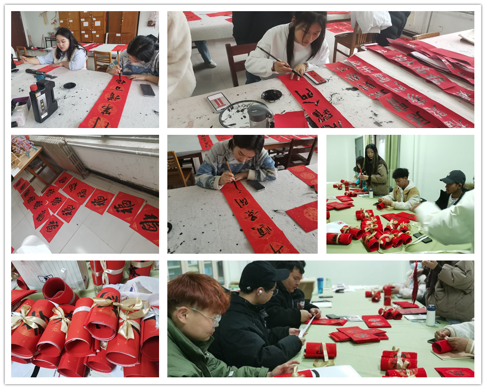 活动中,员工们挥毫泼墨,将寓意美好的句子写在喜庆的春联上。志工部的志愿者们将春联和福字仔细用缎带捆扎好,送给艺术楼外来往的老师和同学们。当天共送出100多副对联和福字。