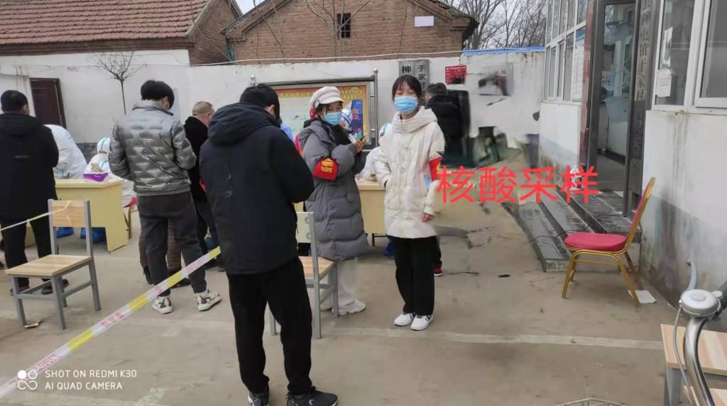 于亚楠同学先后前往于家村卫生院,村口以及向阳小区开展体温检测,车辆信息登记。积极配合医护人员和村委在一天之内完成柳屯镇所有居民的核酸检测。每个人身上都有一包备用口罩,及时分发给没有戴口罩的乡亲们。还要及时的给现场进行酒精消毒。最后挨户排查了所有居民,保证他们每个人都进行了核酸采样。