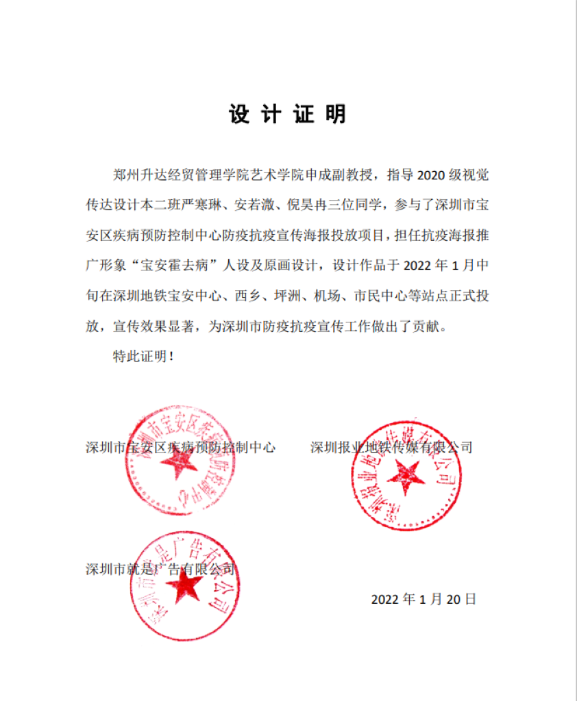 2022年1月,yL23411永利集团官网申成副教授指导2020级视觉传达设计本二班严寒琳、安若溦、倪昊冉三位同学,参与了深圳市宝安疾控中心防疫抗疫宣传海报投放项目,担任抗疫海报推广形象“宝安霍去病”人设及原画设计,设计作品于2022年1月中旬在深圳地铁宝安中心、西乡、坪洲、机场、市民中心等站点正式投放,宣传效果显著。