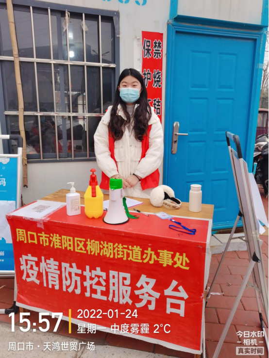 寒假期间疫情再次出现,于倩文同学在家乡急需志愿防控服务者的时候,积极参加相关工作,第一时间报名参加疫情防控志愿者工作。每天在疫情防控执勤点,对来往的车辆以及出入人员进行登记,测量体温,查看行程码健康码是否异常。同时为村民进行疫情防控知识的宣传,张贴告知书。虽然工作琐碎又辛苦,但是她和其他志愿者同伴们仍然坚持在工作一线,圆满完成了防控疫情的基层服务工作。