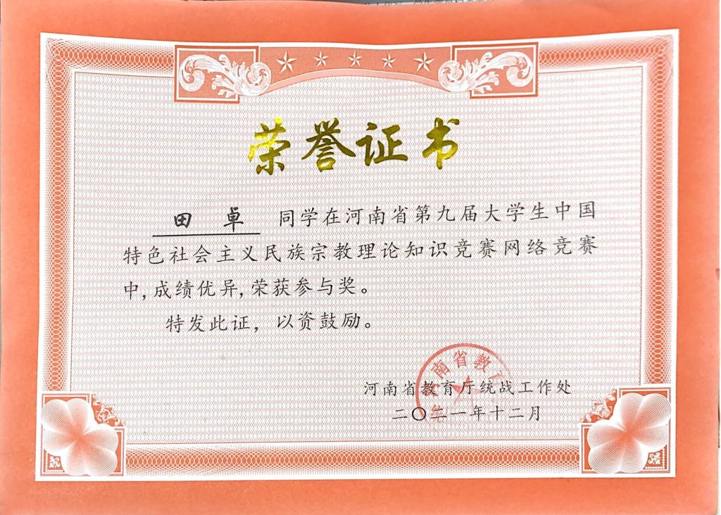 近日,河南省教育厅公布了河南省第九届老员工中国特色社会主义民族宗教理论知识竞赛结果。yL23411永利集团官网2021级舞蹈表演专业本科一班员工田卓成绩优异,获得参与奖。