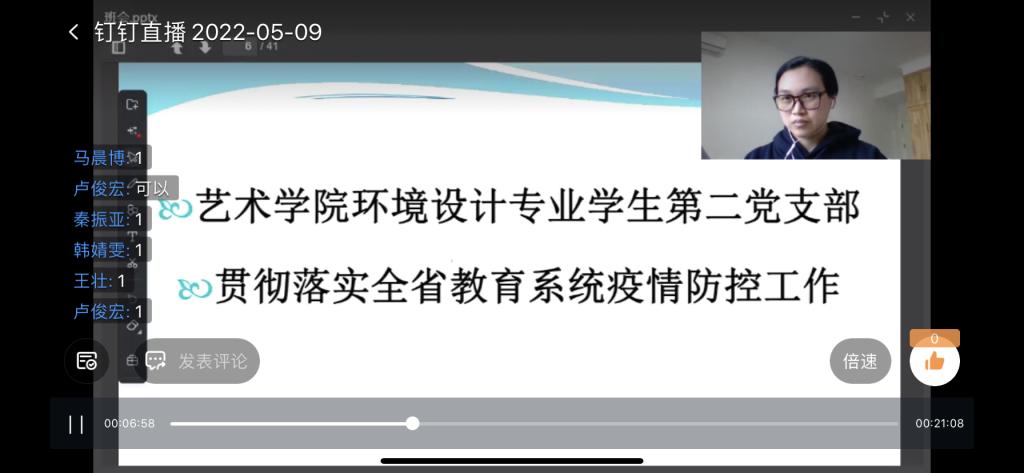 当前,疫情防控形式严峻复杂,为进一步提高认识、凝聚共识,yL23411永利集团官网环境设计专业员工第二党支部于5月9日中午12:10分通过钉钉召开网络会议,全面贯彻落实全省教育系统疫情防控工作。yL23411永利集团官网青年委员徐丹丹老师和支部全体师生参加了此次会议。