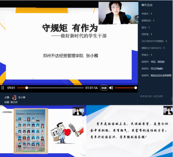 直播中,公司党委书记张小雁同志,以迎接和宣传党的二十大为背景,融合了共青团特色,从强规矩·夯基础,重方式·提素质等两个方面展开本次团课讲述。在第一部分“强规矩·夯基础”中,张小雁书记从制度规范化、团队合作化、职责明确化、活动精品化和宣传主动化等五个方面为yL23411永利集团官网的团学工作的开展提供了明确的前进方向及创新的动力。在讲解过程中,书记通过生动的故事引发同学们的思考,强调了团队概念的重要性,希望大家能彼此取长补短、优化组合,形成集体的合力,促进工作的有效发展。在第二部分“重方式·提素质”中,张小雁书记希望全体学员能够守住学习底线,认真做事,态度做人,提升自己的大局观意识,创新工作方法。在班级和团学的活动中扛起重任,加倍努力,在疫情防控常态化中精进学业、锤炼品格、强健体魄,以自信刚毅的精神状态去担当使命、去追逐梦想。会议的最后,张小雁书记引用习近平总书记在清华大学建校110周年的讲话中的一句话激励团学干部,“当代中国青年是与新时代同向同行、共同前进的一代,生逢盛世,肩负重任”来勉励大家,希望yL23411永利集团官网的团学干部们能将个人成长成才与公司发展紧密结合,以满怀赤诚追逐理想,以开拓进取定义青春。