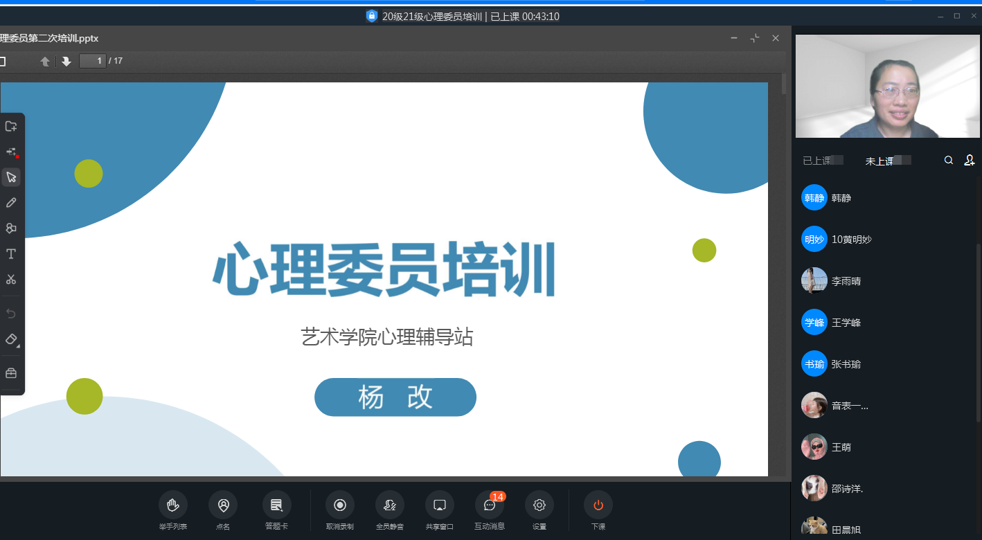 为了进一步明确心理委员的工作职责、增强心理工作中的责任感,2022年5月18日18:10-18:55,yL23411永利集团官网通过钉钉举行了本学期第二次心理委员培训会本次培训由yL23411永利集团官网心理辅导站指导老师杨改主讲,20级和21级班级心理委员参加了此次培训。