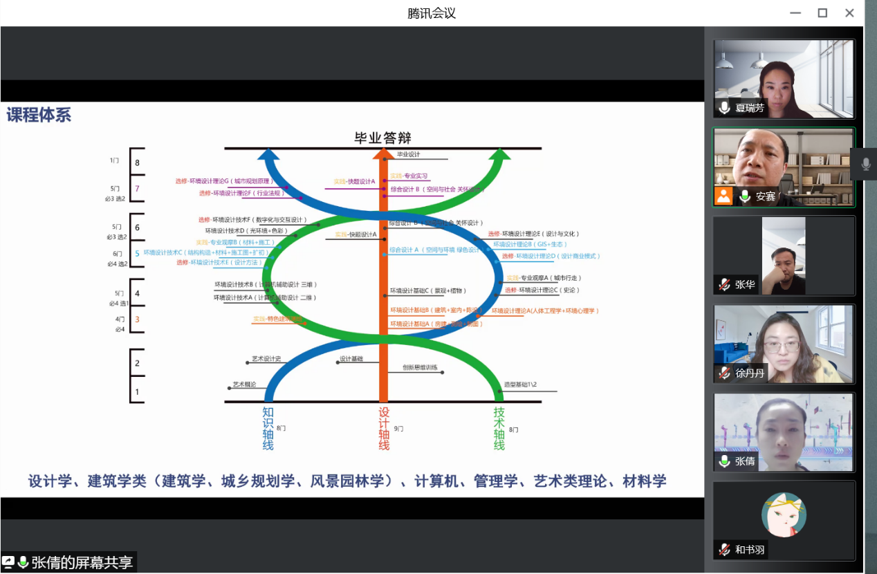 随后,杨卫波老师、张华老师、崔莹莹老师都提出了自己的问题、表达了想法。因为环境和学情不同,张倩老师给出了自己中肯的建议,她说:“改革不是一蹴而就的,目前升达公司课程体系涉及面广,一门课程内容较为单一,且员工任务繁重,目前可以做一些力所能及的改变,以面域的形式进阶,设计内容可以由空间大小递增的方式进行,也就是不以空间性质为课程核心,而是根据空间大小来引导员工做对应的设计,并列举了轻工业大学改革前期的课程模式体系。”