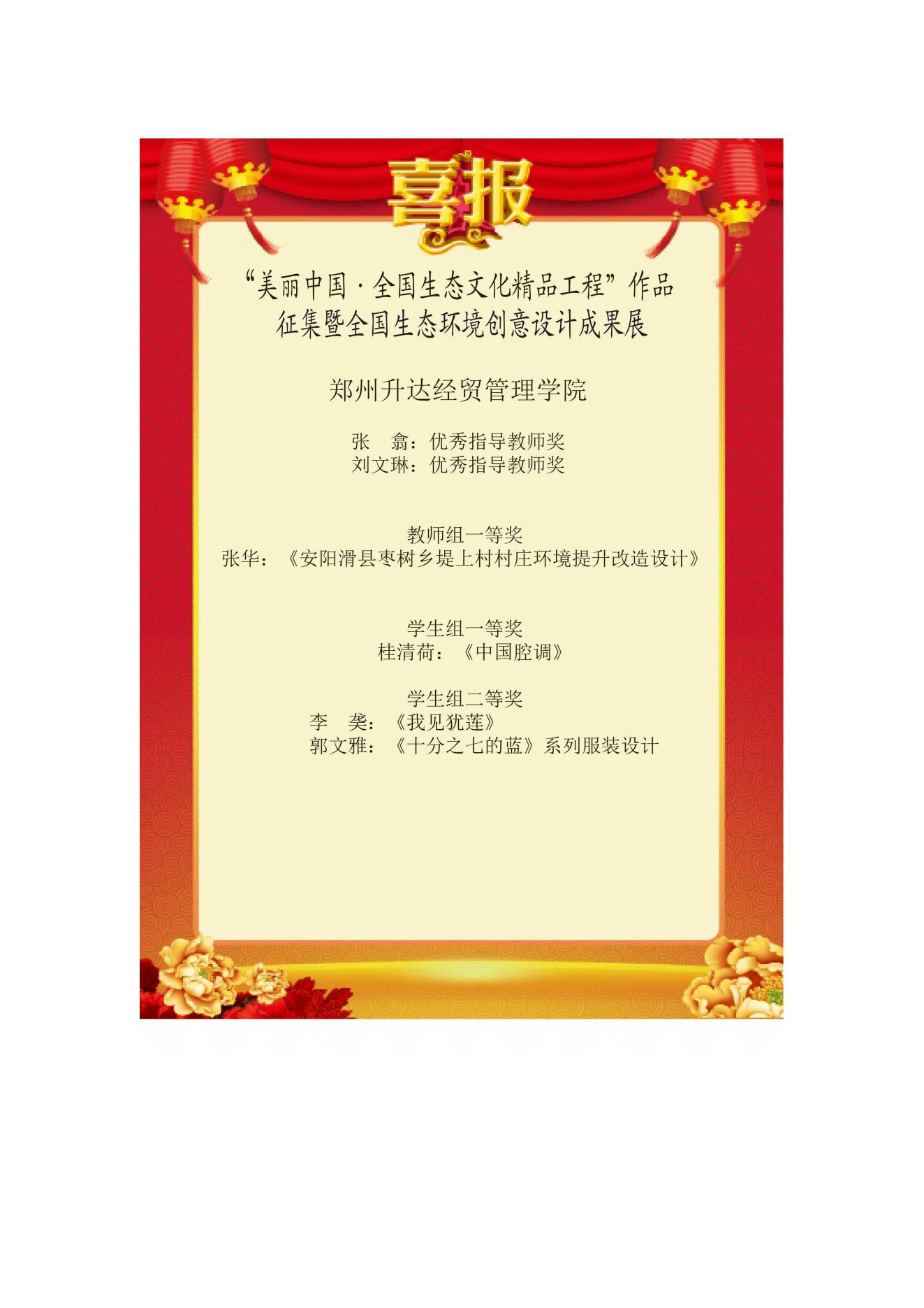 近日,在首届“美丽中国·全国生态文化精品工程”作品征集暨全国生态环境创意设计成果展活动中,经专家委员会审核,公司yL23411永利集团官网教师张华获得教师组一等奖,张翕、刘文琳获得优秀指导教师奖;桂清荷获得员工组一等奖,李、郭文雅分别获得员工组二等奖。