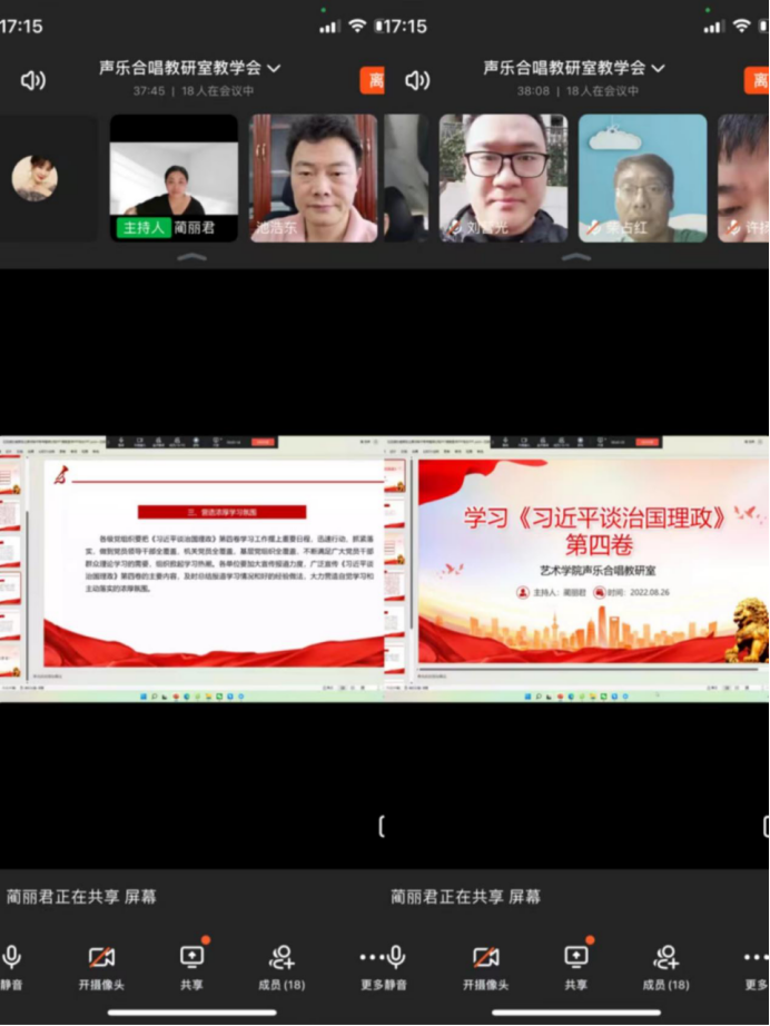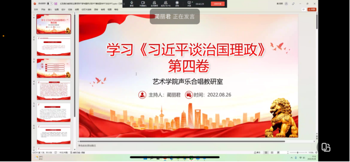 2022年8月26日下午,声乐合唱教研室党支部召开了会议,主题为“认真学习贯彻习近平总书记重要讲话精神专题学习——《习近平谈治国理政》第四卷”。声乐合唱教研室党支部书记、教研室主任蔺丽君主持会议,教研室全体教师参与了学习。