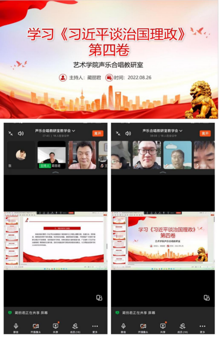 2022年8月26日下午16点40分,声乐合唱教研室党支部线上召开主题会议,“认真学习贯彻习近平总书记重要讲话精神专题学习——《习近平谈治国理政》第四卷”。声乐合唱教研室党支部书记、教研室主任蔺丽君主持本次会议,教研室全体党员、非党员教师18人全部参与了学习。