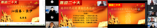 本次“追寻红色足迹 重温经典诗词”线上朗诵活动成功举行,既有经典作品的背景解读,也有原创作品的深情吟诵,老师们铿锵有力、慷慨激昂地朗诵着,领略经典作品的永恒魅力,感受中国共产党人前赴后继、百折不挠的奋斗精神。