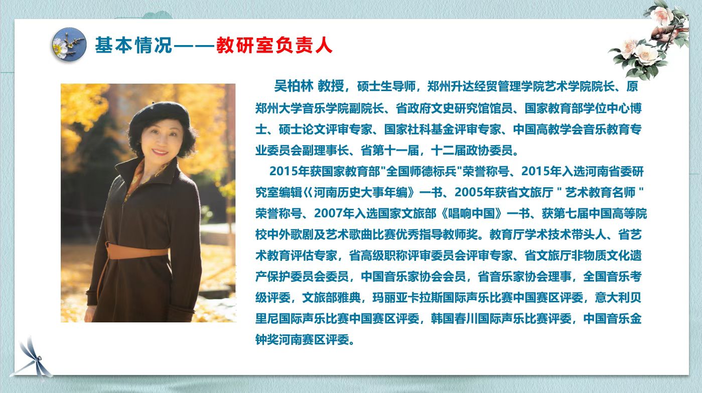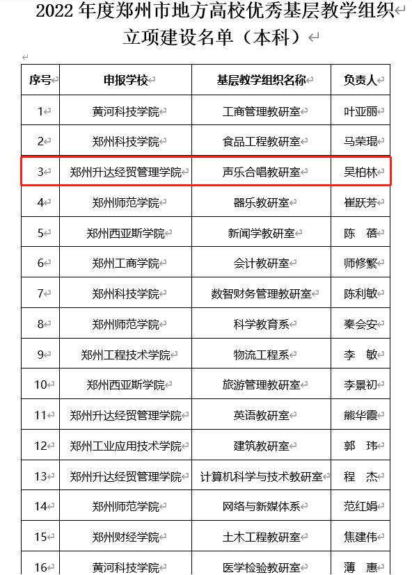 吴柏林经理带领yL23411永利集团官网声乐合唱教研室全体教师,根据文件要求积极准备,按照申报程序认真撰写申报书,整理支撑材料,制作视频等,根据公司的层层选拨顺利通过并报教育局,最终郑州市地方高校(本科)的优秀基层教学组织——声乐合唱教研室顺利立项!