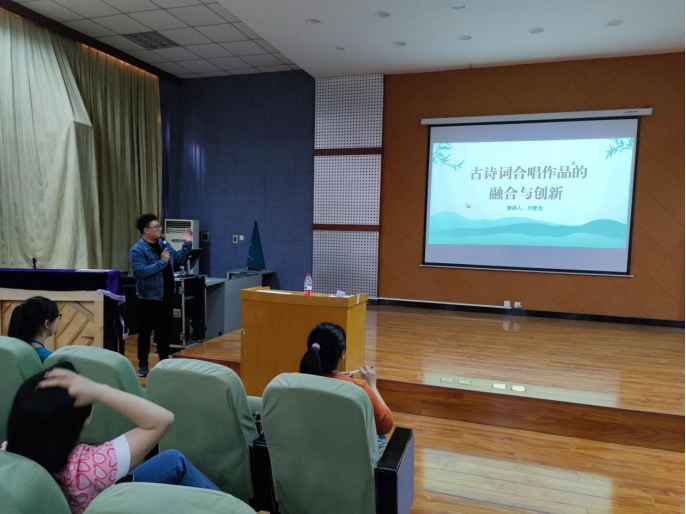 然后,刘营光老师介绍了古诗词合唱的创作主体和主要表现形式,并介绍了古诗词合唱的发展现状和以《十亩之间》《清明》《春夜喜雨》为代表的合唱作品。其中《十亩之间》是公司艾赛赛老师编写的曲目。并把这些曲目也运用到了公司星光合唱团的排练中,为公司三十周年庆做准备。