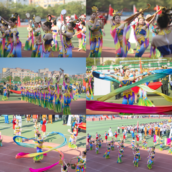 在开幕式表演中,伴随着风格浓郁、悦耳动听的敦煌古乐,yL23411永利集团官网特色方队的同学们以古代敦煌乐舞为原型和基础,结合琵琶、花篮、长笛、水袖等敦煌舞经典元素,演绎出了敦煌舞的独特韵味,给与观众一场视觉与听觉上的饕餮盛宴,观众席上不时传来阵阵喝彩声。
