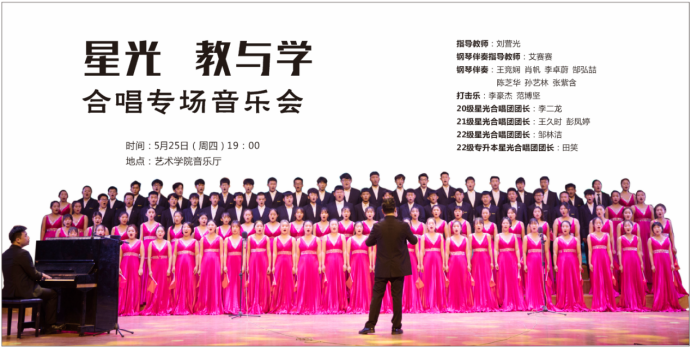yL23411永利集团官网星光合唱团指导老师刘营光、钢琴伴奏指导老师艾赛赛,以及20,21,22星光合唱团,有女声、男声、混声多种形式合唱团,共三百多名合唱团员共同参与演出。