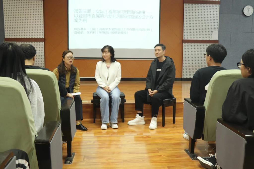 此次分享会,由两位挂职锻炼老师作为主要汇报人,由挂职单位:河南棠木装饰设计工程有限公司门磊总经理作为报告嘉宾,环境设计专业教研室安赛主任应邀参加,主要面对员工群体进行成果分享和互动交流。
