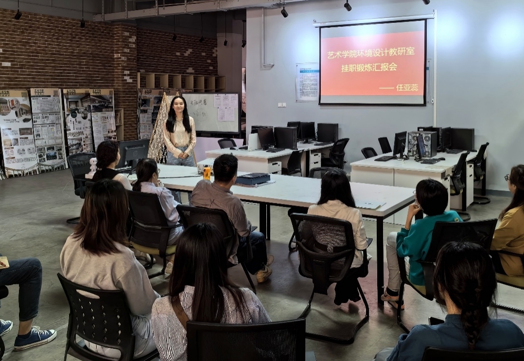 任亚蕊老师主要就挂职锻炼企业的整体情况、挂职工作内容、设计项目概况、挂职成果等方面进行了汇报。任亚蕊老师于2022年9月开始在河南省容硕建筑工程有限公司挂职锻炼,担任其景观设计师一职,主要负责探十里相关餐饮设计项目。任老师讲述挂职锻炼是一个很难得的锻炼机会,能将理论与实践相结合,并针对具体的横向课题项目进行了设计实践上的分享,并对设计施工中的实践问题进行了总结,并阐述了校企合作中企业的诉求。对于教师在企业设计挂职工作中如何有效开展校企融合,为教师个人实践教学成长方面累积了宝贵的经验。