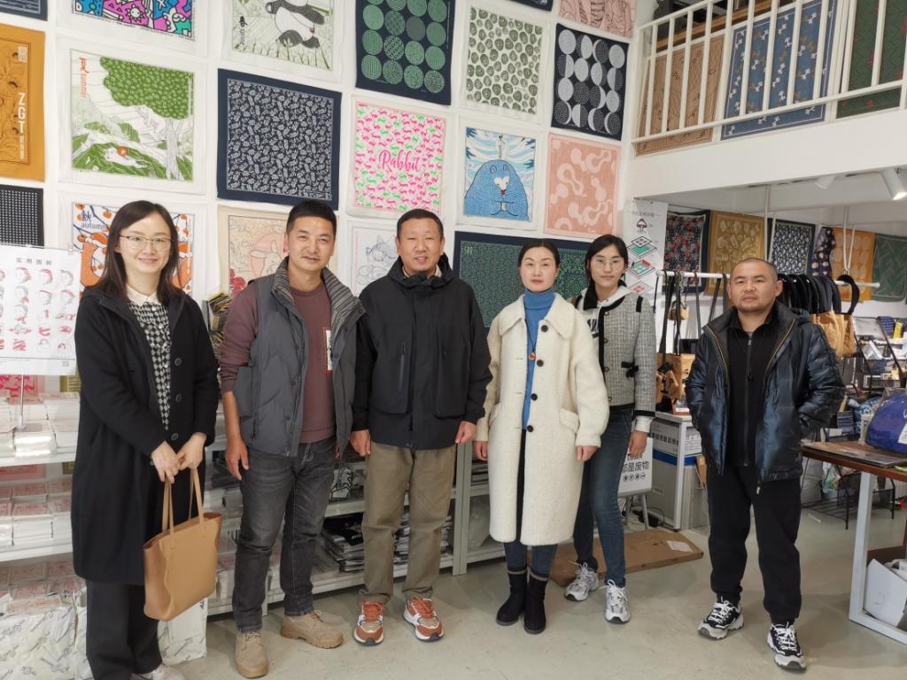 首先,在织耕堂高经理的引荐下,教师们参观了织耕堂针织布艺类产品创意展示厅,详细了解了不同布艺材质的产品设计效果、传统丝网印刷工艺在文创产品设计领域的应用与市场需求和发展前景。参观中与“织耕堂”负责人高经理就深化校企合作、创建校内外员工实习实践基地、助力拓展员工就业等内容进行了广泛交流。
