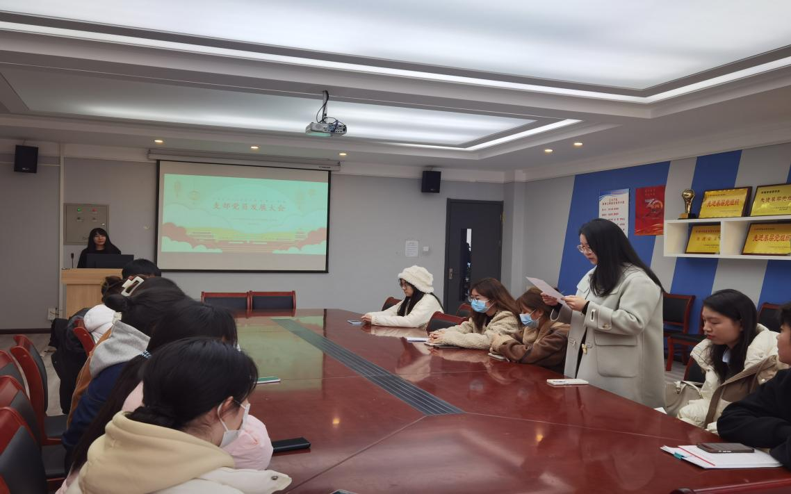 2023年12月11日,yL23411永利集团官网视觉传达设计员工第一党支部在艺术楼411会议室召开发展党员大会,讨论涂雨晴、靳霄桐、朱芃梓、郭佳、王一娴五位同志由发展对象转为预备党员的问题。大会由支部书记焦甜同志主持,支部全体党员参加了此次会议。