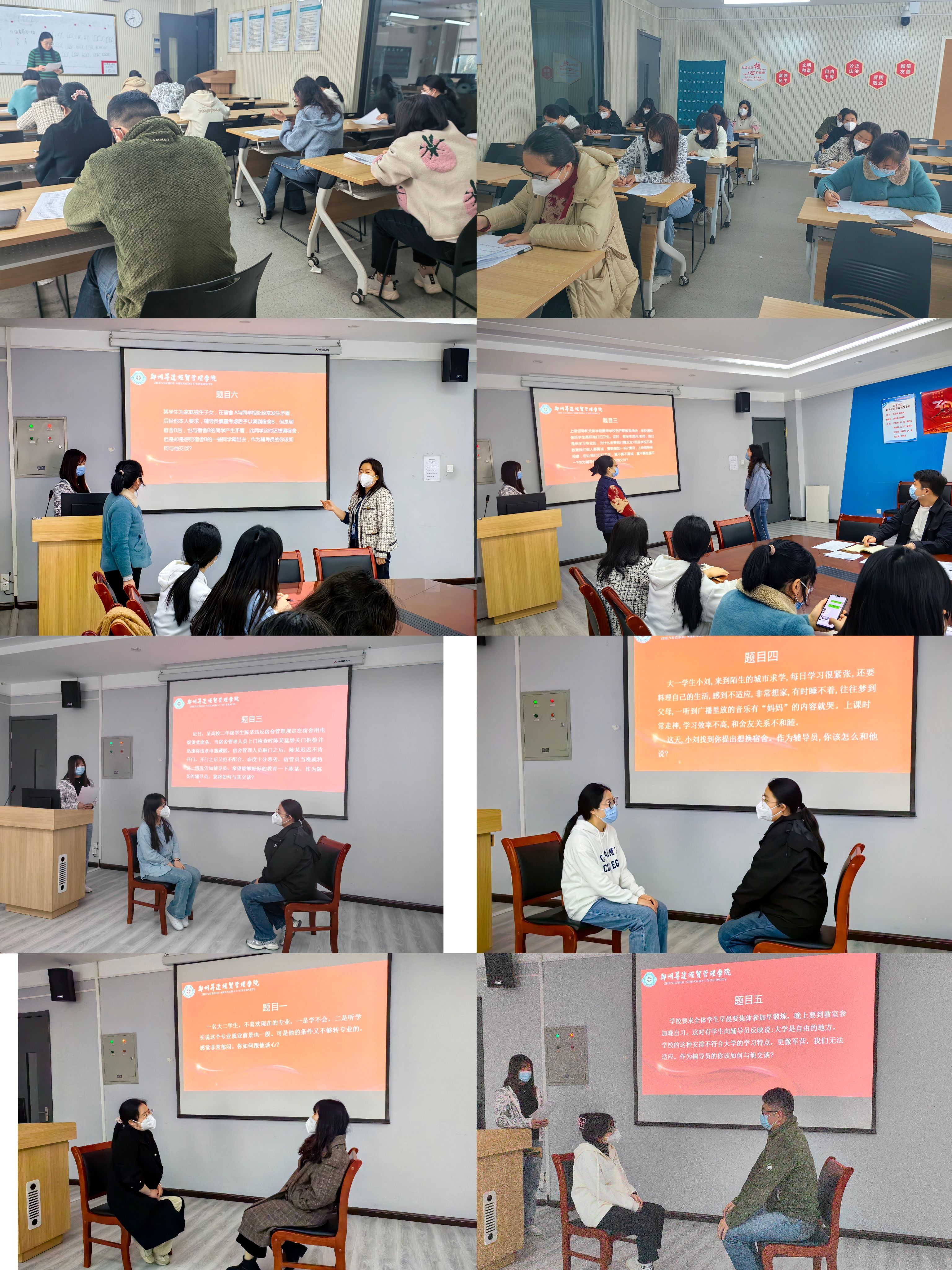 27日上午,yL23411永利集团官网辅导员老师在艺术楼302教室进行了笔试测试,测试内容从国家政策到法律法规,从政策文件到工作务实,从校规校纪到校史校情,考察全面。辅导员们以笔试为契机,将理论学习抓在平常、学在日常、用在经常,为日后工作打下坚实的理论基础。下午,辅导员老师们进行了比赛当中的案例研讨和谈心谈话环节。案例研讨环节,老师们坚持立德树人的教育理念,立足工作实际,从分析问题、研判问题、解决问题等几个层面入手,通过AB角“一问一答”的形式,围绕所抽到的案例进行分析研讨,全面展示了辅导员的专业素养、逻辑思维及语言表达能力。“谈心谈话”是辅导员贴心员工、走进员工的现场模拟测试环节,面对员工在学习、生活、工作、情感等各类突发状况和棘手问题,辅导员们认真倾听、正面引导,在“动之以情、晓之以理、导之以行”的积极沟通中,帮助员工走出阴霾,展现了辅导员老师扎实深厚的业务基础、信息抓取分析以及教育引导能力。