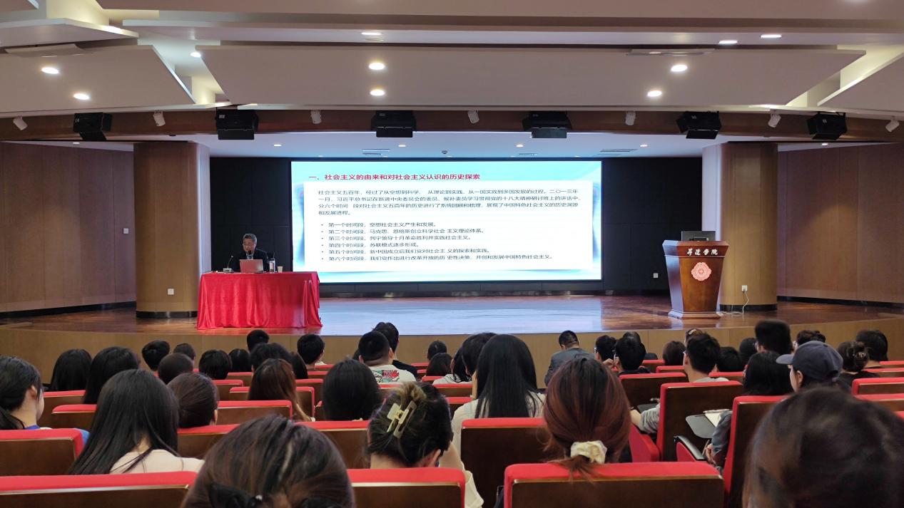 郑发展教授首先以世界社会主义的发展历程为开端,分别从新民主主义革命时期、社会主义革命和建设时期、改革开放和社会主义现代化建设时期、中国特色社会主义新时代四个时期分别进行论述,以党的历次会议为主线,详细讲解了从中共一大到党的二十大的重点内容以及历史地位意义,让在场所有人员深刻感受到了党的伟大历程和宝贵经验。最后,郑发展教授强调新时代新征程,我们要深入学习贯彻习近平新时代中国特色社会主义思想,将中国特色社会主义伟大事业不断推向前进,最紧要的是深刻领悟“两个确立”的决定性意义,增强“四个意识”、坚定“四个自信”、做到“两个维护”,自觉在思想上政治上行动上同以习近平同志为核心的党中央保持高度一致,不断汇聚新时代全面推进中华民族伟大复兴的磅礴力量,实现全面建成社会主义现代化强国的目标。