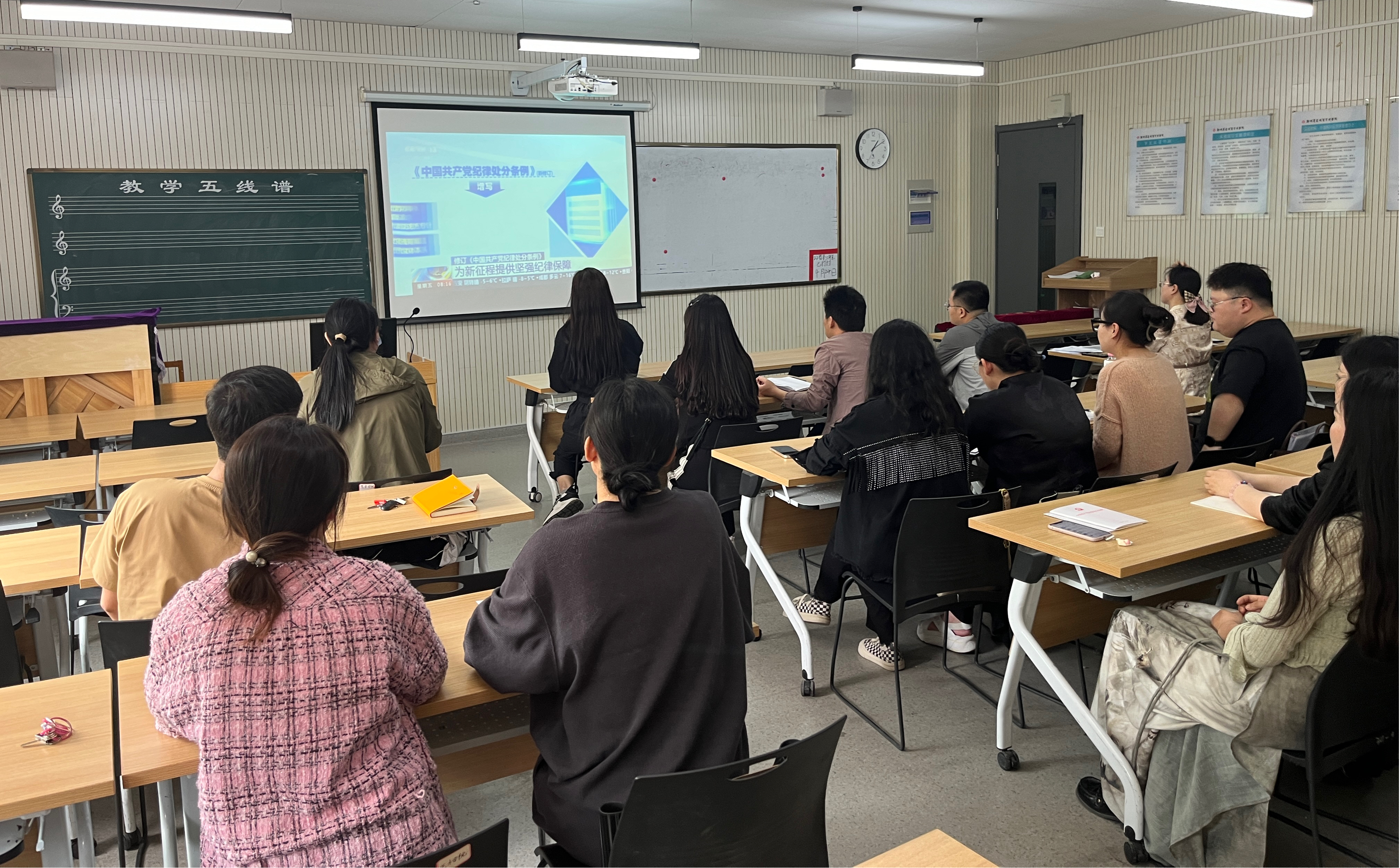 2024年4月28日,公共艺术教研室党支部全体党员在艺术楼302开展了对于新修订《中国共产党纪律处分条例》的专题学习。本次学习活动由公共艺术教研室党支部书记吴则斌老师主持开展。
