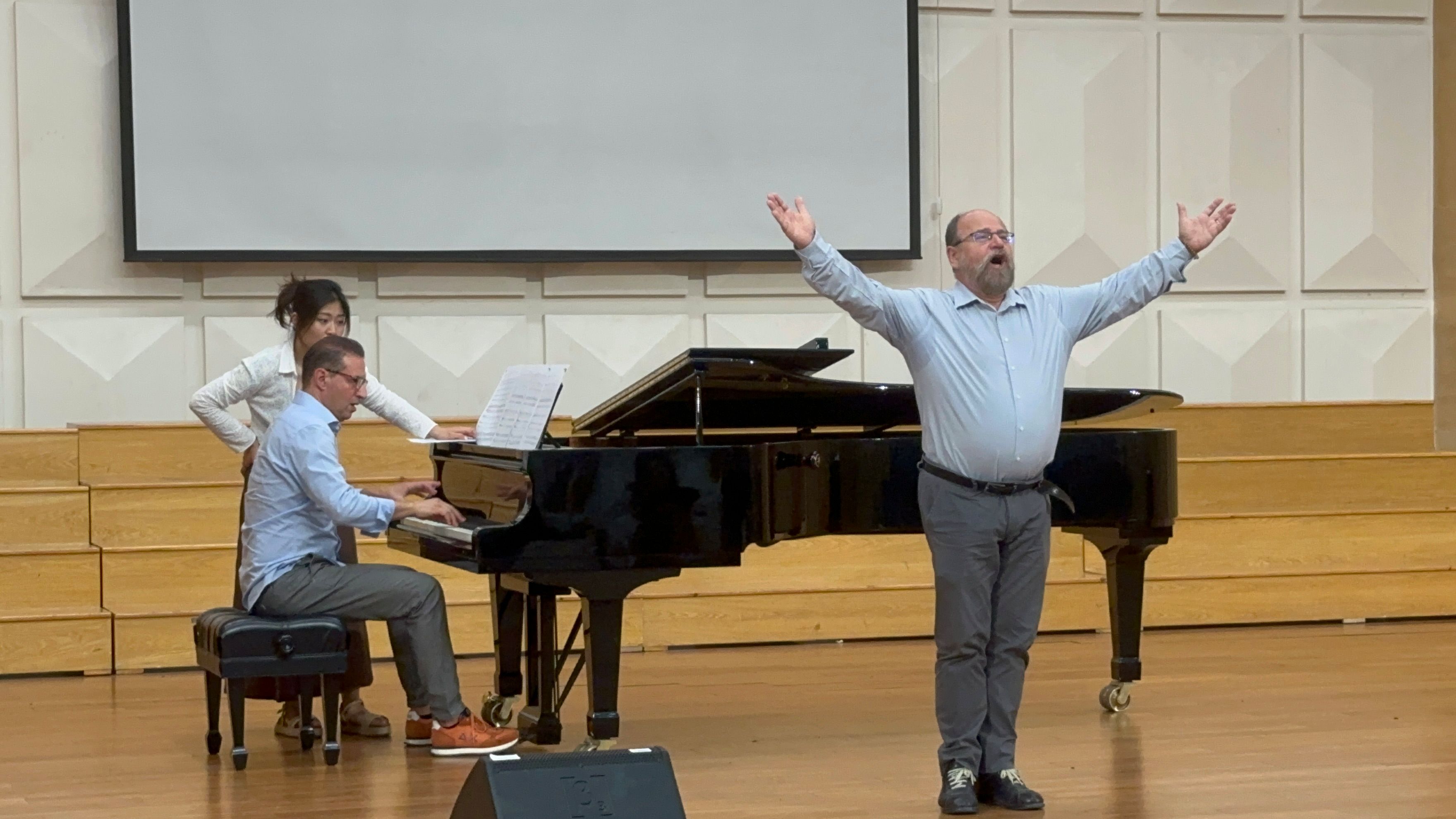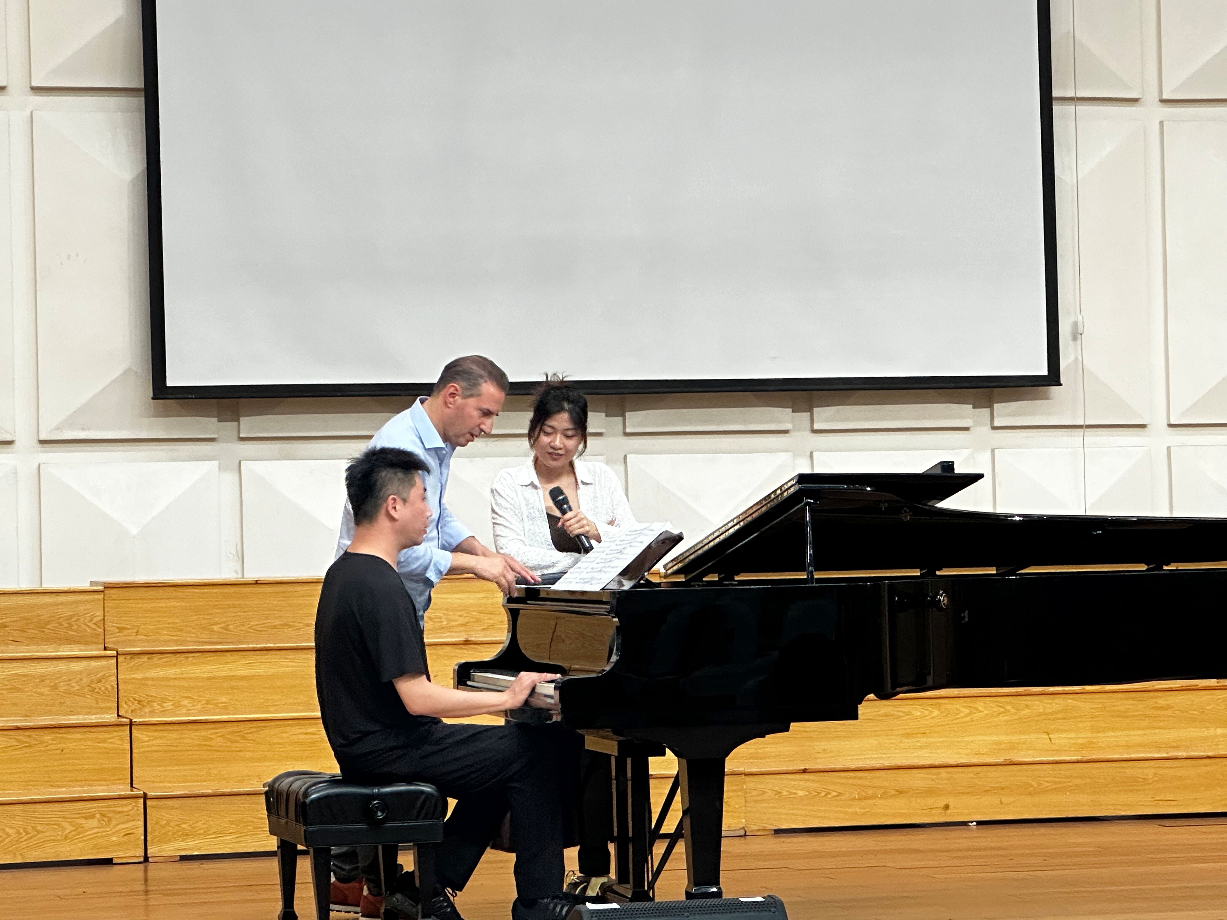 在大师课上,来自热那亚音乐公司的歌唱家克劳迪奥·奥蒂诺教授对公司教师刘新义及两位同学的声乐演唱进行指导,根据演唱者的特点和需求提出了针对性的建议,展现了其丰富的声乐表演及教学经验。随后,来自拉斯佩齐亚音乐公司的钢琴家皮耶罗·加迪教授对公司教师艾赛赛及两位同学的钢琴演奏进行指导,就音乐作品和演奏技法分享自己独到的见解,引导演奏者探索不同的表达方式。两位教授的讲解使在场的老师和同学们受益匪浅,对音乐有了更深层次的理解和感悟。最后,两位教授合作演绎了罗西尼喜歌剧《阿尔及尔的意大利女郎》中的咏叹调《我的头变得很重》,收获了热情的掌声和欢呼。