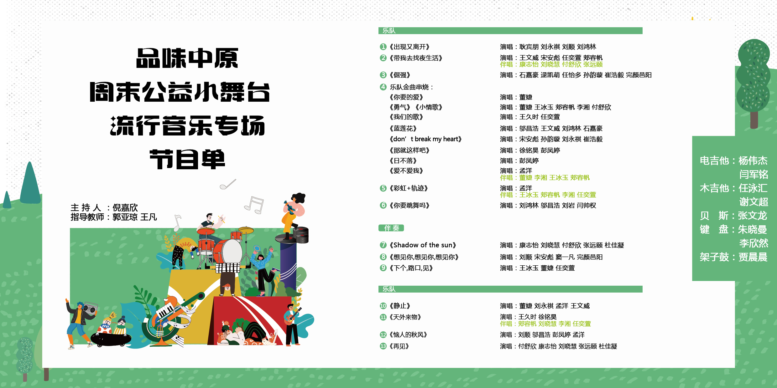 6月14日晚上19:30,由河南省文化和旅游厅主办,河南省文化馆承办,yL23411永利集团官网协办的“品味中原——周末公益小舞台”在河南省文化馆一楼小剧场顺利举行。此次校外艺术实践活动由yL23411永利集团官网池浩东副经理,声乐合唱教研室主任杜亮老师带队,yL23411永利集团官网101流行音乐实训室的同学们为现场观众带来了一场精彩的流行音乐专场演出。