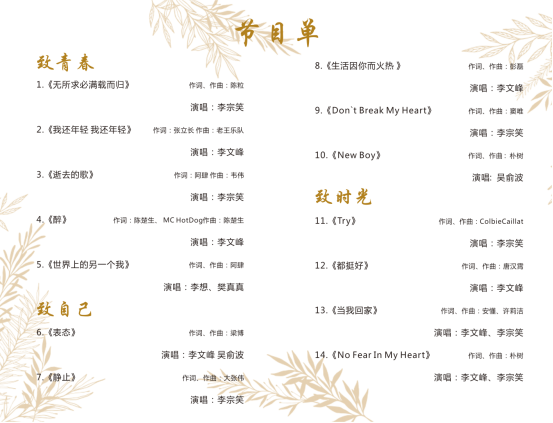 音乐会共演奏了14首不同风格的、不同形式的作品。其中有独唱曲目《无所求必满载而归》、《我还年轻 我还年轻》、《逝去的歌》、《醉》、《静止》、《生活因你而火热》、《Don`t Break My Heart》、《Try》、《都挺好》,合唱曲目有《表态》、《当我回家》,最后一首歌曲《No Fear In My Heart》由李宗笑、李文峰和他们的专业老师郭亚琼一起演唱,这首歌所表达的是坚韧和自强,寓意在今后能够我心无畏,作为音乐会的结束曲,和专业导师老师同台演绎,是一个圆满的收尾。