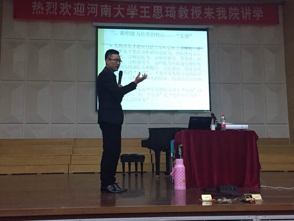 讲座在我系肖生主任真挚而又精彩的致辞中拉开帷幕。王思琦教授讲座的主题为《流行唱法的理论和实践》,共分为理论与实践两部分。