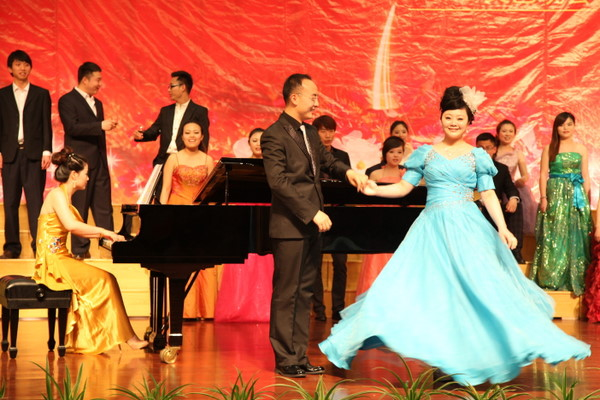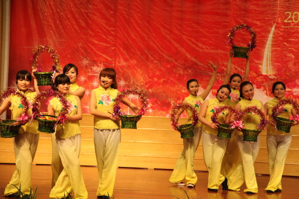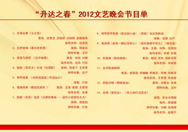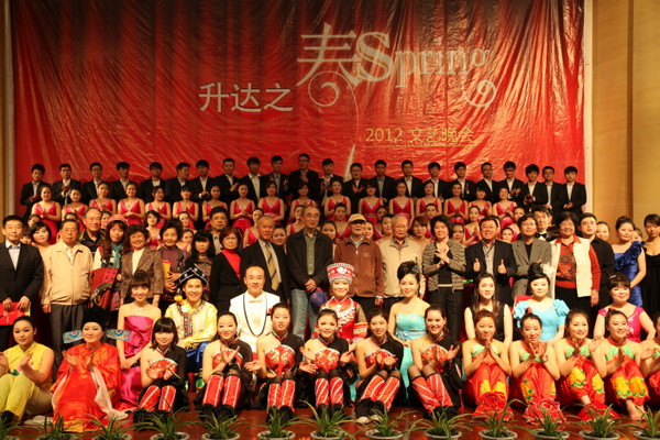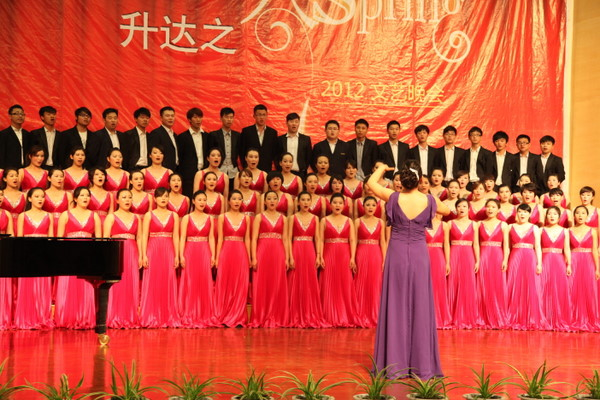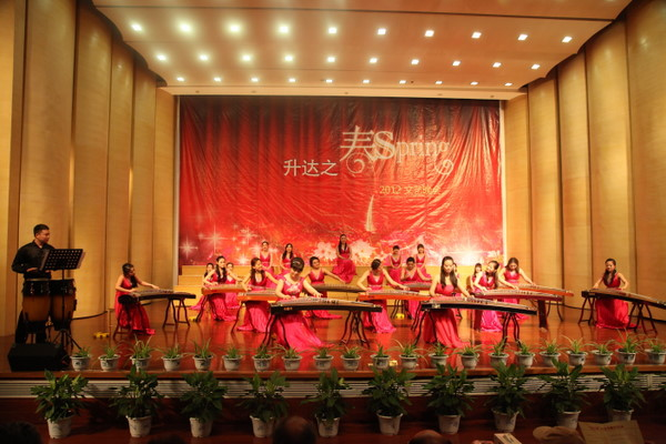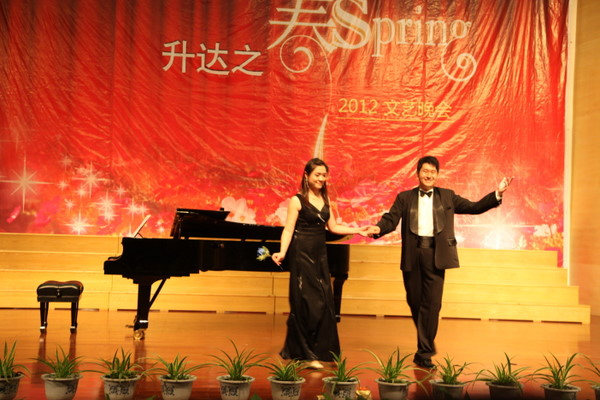 2012年4月19日晚,艺术大楼音乐厅灯火辉煌,高朋满座,“升达之春——2012文艺演出”在这里隆重举行。新聘兼职教师杨金花带来了女声独唱《春天的芭蕾》,绚丽的花腔女高冲击了每位观众的心,全场欢声雷动,成为音乐会的热点;我系青年教师庄严和钢琴博士吴娜老师的四手联弹《新法国小曲》、《赛跑》,刘新义、张爽两位老师带来了电影《五朵金花》片段《蝴蝶泉边》的山歌对唱,付佳老师的钢琴独奏《肖邦谐谑曲二作品Op31》,兼职教师郭雲喆带来了男声独唱《看这位小姐那位太太》,陈家宁、王梦莹两位老师携二十多位同学为大家展演了歌剧《茶花女》片段(饮酒歌)等掀起了文艺晚会一次又一次的高潮。在此次音乐会中,三位舞蹈老师表现尤为突出,在这么短的时间内,面临我系没有舞蹈专业员工的困难下,依然排练出了多个集体成品舞,王凯老师编排了《鼓舞东方》、孙祯意老师编排了《新韵秧歌》和台湾经典歌曲联唱的舞蹈动作,其中张森老师编创了健身排舞《最炫民族风》和戏曲表演唱的整套舞蹈动作,在演出中大放异彩,受到观众的热烈欢迎。除此之外,在本次演出中我们尝试了声乐演唱与古筝演奏的合作《云之南》,钢琴与单簧管的合作《空中城堡》等成为了音乐会的亮点。文艺演出在我系星光河床团的《菊花台》和《铃儿响叮当变迁》中落下帷幕,演出圆满成功,受到创办人及台湾贵宾一行的高度赞扬,也为2012年的升达之春描上绚丽的一笔。
