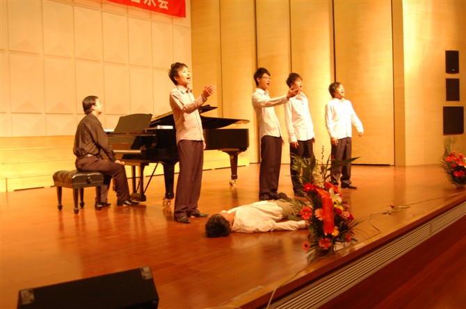 本次音乐会有一个特别的节目,让大家在哼唱我们民族特色民歌时,还能记住那一段刻骨铭心的历史。下面这几位小伙儿在为大家演唱原生态民歌《山东小调》。