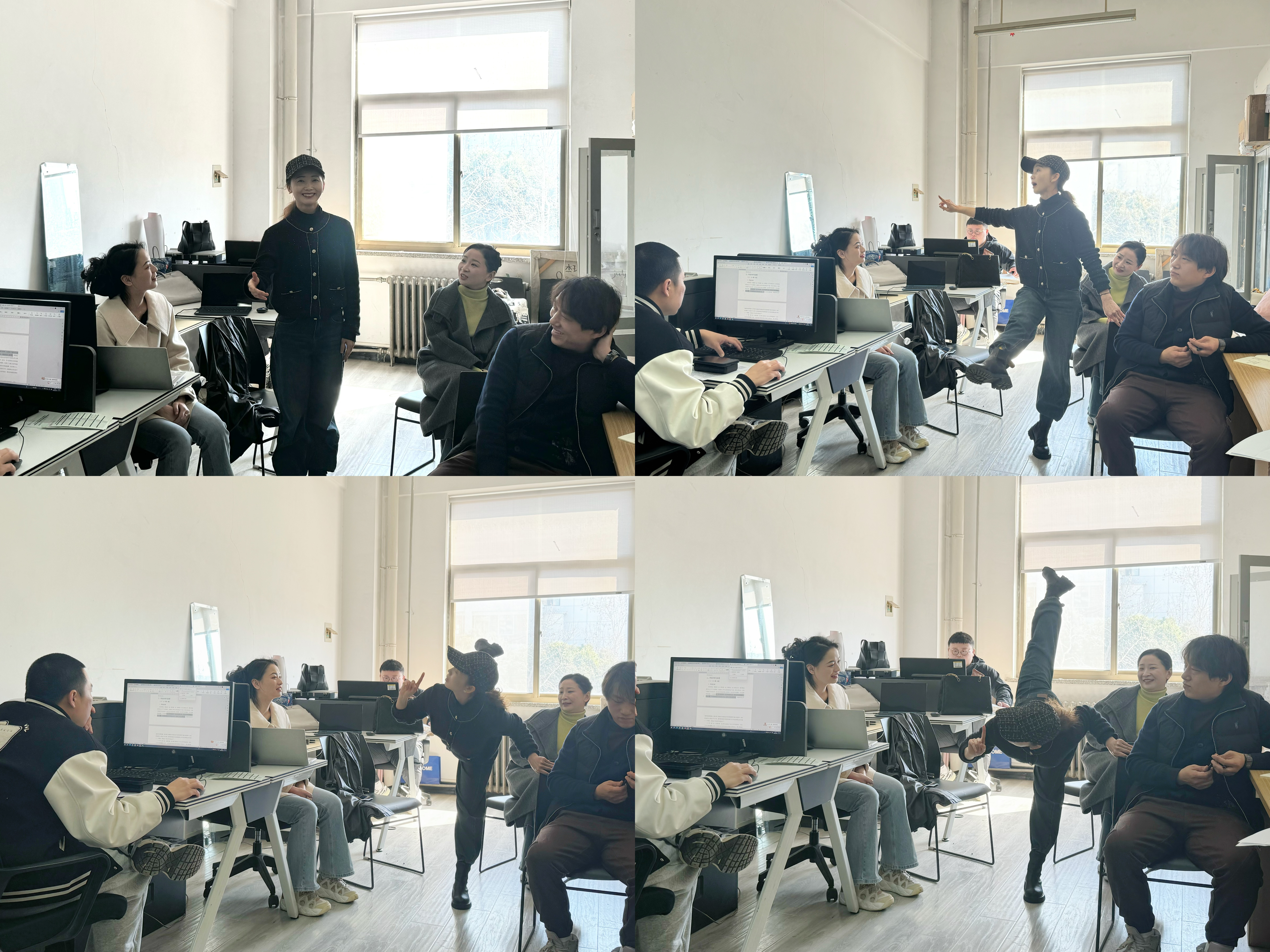 活动现场,教师们依次进行了精彩的课程示范与教学研讨。段主任的《敦煌舞基础II》以“飞天形象”为核心,通过单人到双人的造型训练,深化员工对敦煌文化的理解与艺术表现力。在《中国民族民间舞基训1》手位组合教学中,沈振宇老师通过融入藏族舞蹈风格性元素,将传统技法与民族特色相结合,有效提升了课堂的趣味性与实用性;毛宝杰老师的《芭蕾基训II》课程则聚焦中间练习,通过反复打磨二位中跳、分腿跳等动作,强化员工的腿部力量与空中控制能力;张森老师的《现代舞II》教学中,引导员工探索呼吸与动作的协调性,通过即兴练习帮助员工理解呼吸在舞蹈中的重要性。