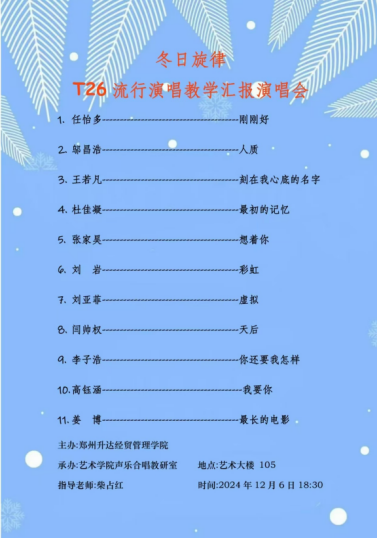 2024年12月6日18:30,冬日旋律——T26流行演唱教学汇报演唱会在艺术楼105成功举办,演唱会节目的组织和表演主要有yL23411永利集团官网柴占红老师大一至大四的员工完成,这是继“2024春天来了——T26流行演唱音乐音乐会”后T26琴房的又一次舞台实践演出。