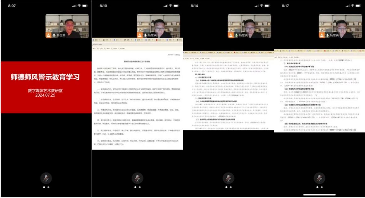 2024年7月29日,数字媒体艺术教研室召开了师德师风建设警示教育学习,全体教研室教室由杨杨世英主任带领,通报了近期高校处理涉师德师风舆情事件,并带领全体教研室教师进行学习。