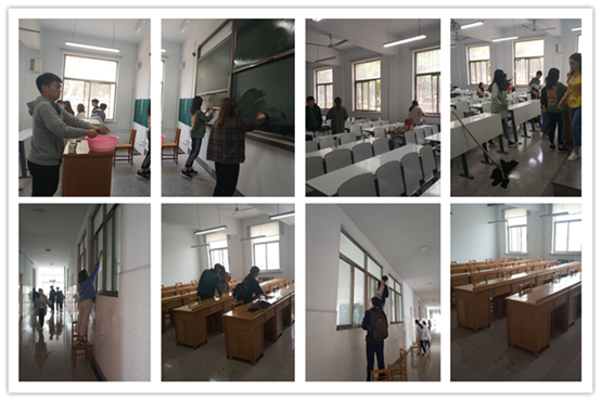 各班同学在辅导员老师及班委的带领下,分工合理,目标明确,活动开展的秩序井然。同学们纷纷拿起抹布、扫帚等清洁工具对教室的门窗、地面、桌椅、墙角等卫生死角进行全面彻底的清理和打扫,活动过程中,他们互相帮助,不怕苦,不怕累,在全体同学的努力下,经过两个半小时,大家顺利完成了大扫除任务。