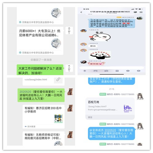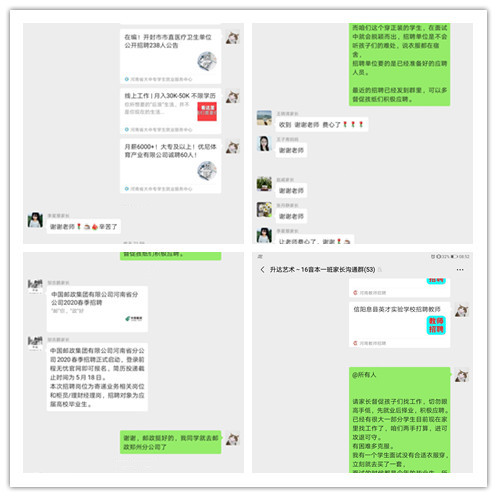 “微信群”自然成为一个有效的抓手。在执行公司网格化管理制度下,就业工作也进行网格化管理,精准投放。针对毕业生群体的差异化发展需求,yL23411永利集团官网建立了“就业加油群”,“家校沟通群”等,形成了覆盖不同员工群体的精准化指导群组,强力推进公司毕业生就业工作。