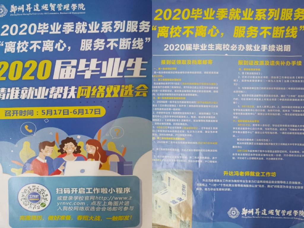 “离校不离心,服务不断线”服务具体包含“就业宣传、精准帮扶、手续办理、”一系列相关活动,为2020届毕业生离校后基本实现更充分、更高质量的就业保驾护航。