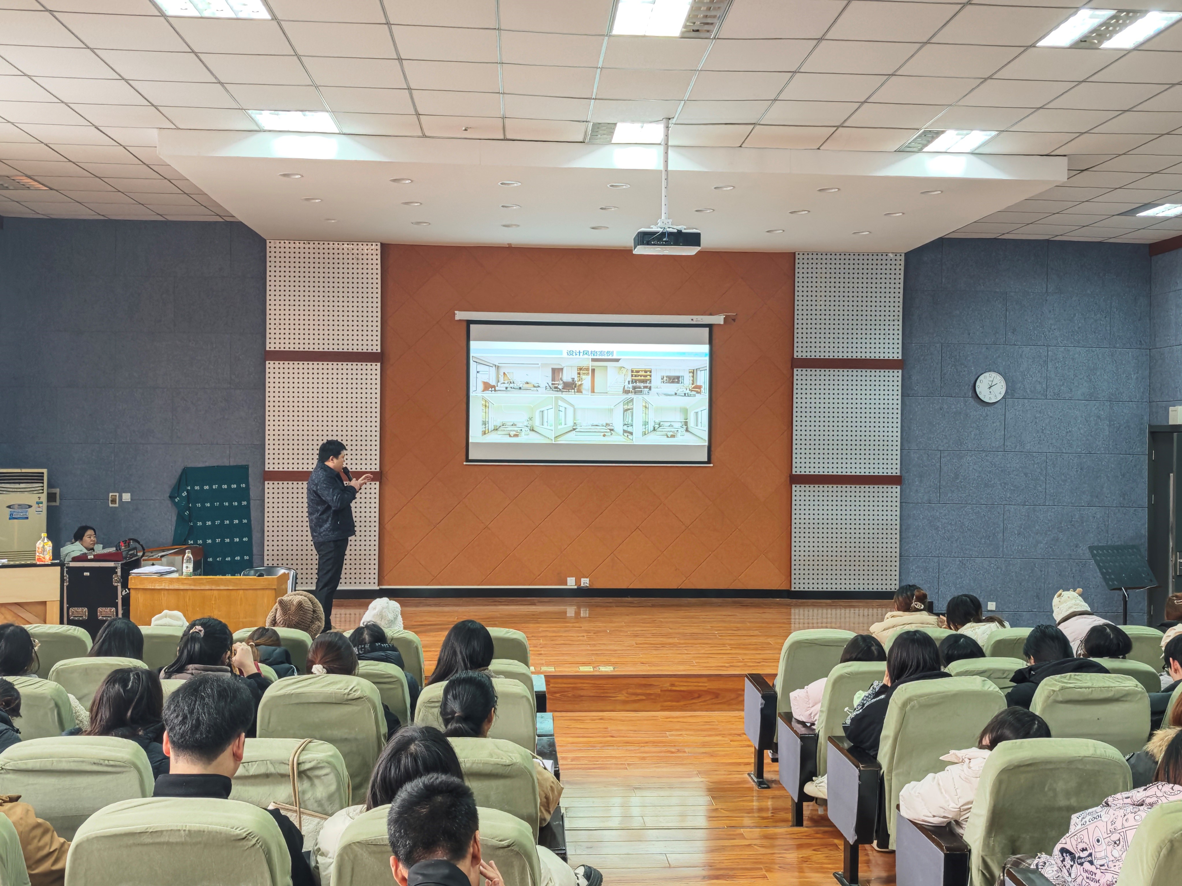 张红增员工首先进行了简单的自我介绍;随后,张红增员工结合自己多年的创业经历与大家分享了:设计是什么?设计的起源、设计与绘画、设计与生活、怎样算好的设计。接着他讲述了不同职业群体的需要的设计风格和设计风格的案例分析。他从基层岗位做起,一步一个脚印,逐步积累经验,拓展人脉资源,最终实现了自己的职业目标。他紧接着讲述了施工流程、毛胚房装修的全流程,他还向同学们展示了施工工艺和施工现场照片。他还分享了自己在实习期间如何积极主动地向同事请教,如何在项目中不断学习和成长的经历,鼓励同学们勇敢地迈出实践的第一步。