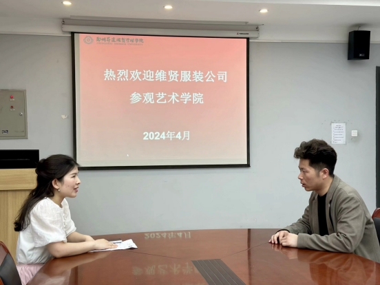 维贤服装有限公司隶属于维贤(郑州)商业管理有限公司,从1996 年成立以来,27 年专注经营服装行业,目前公司实力在行业内占有领先优势。4月16日下午维贤服装有限公司经理刘凌蔚来院参观,公司党委书记张小雁、行政秘书尹红艳、就业专员王鸿飞热情接待。